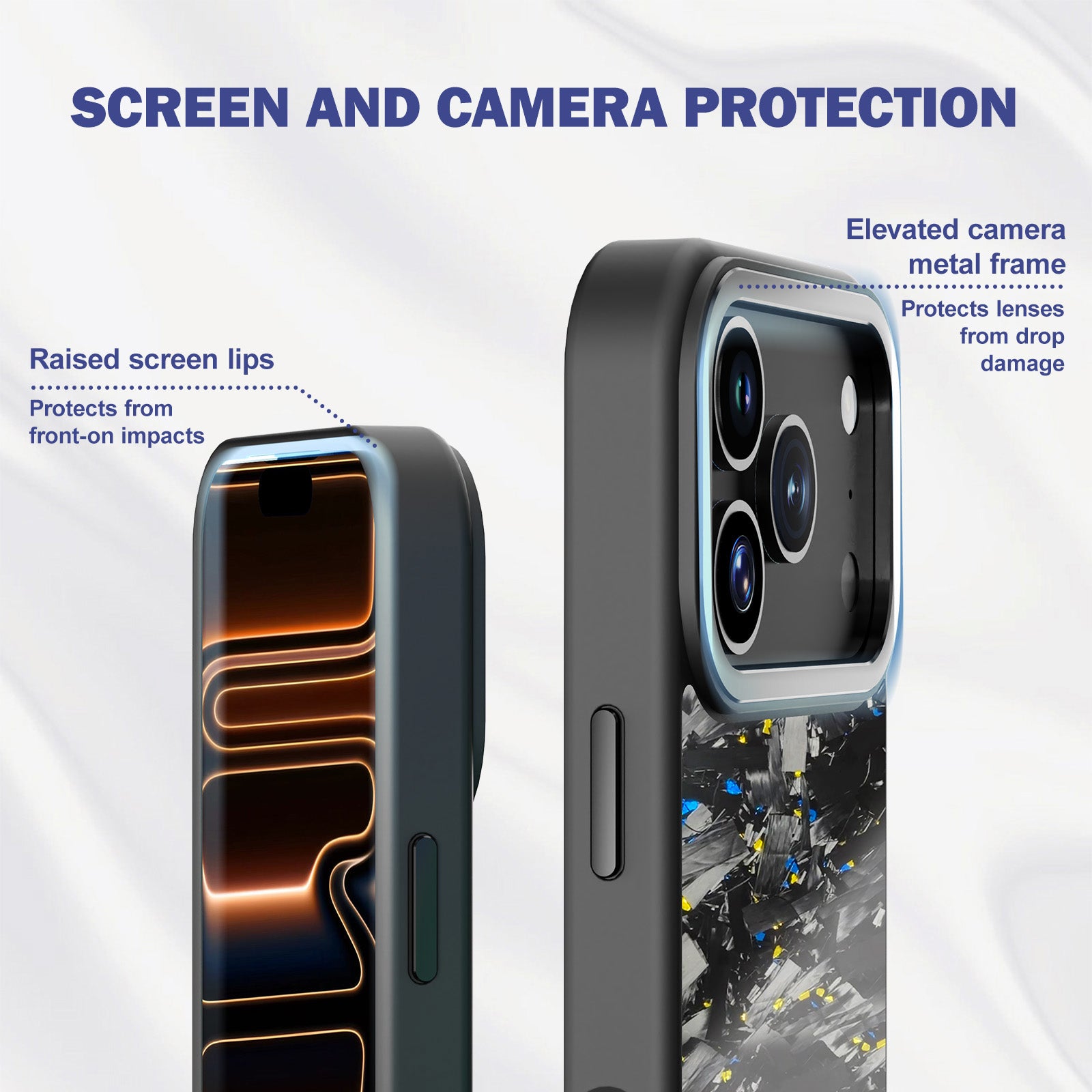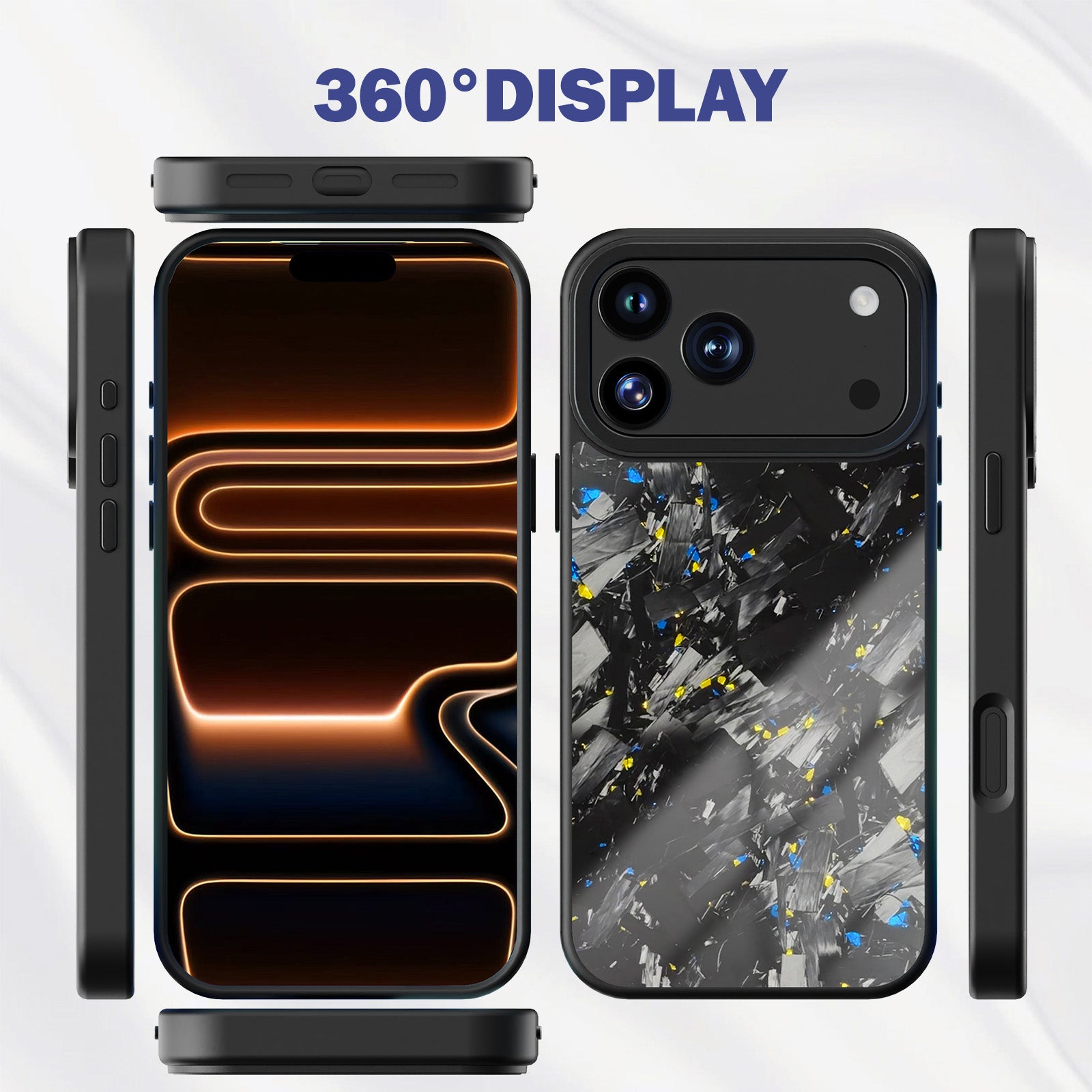 Introducing the Molzar Vibe Series, the ultimate case designed to make your iPhone 17 Pro Max stand out. Each case is a one-of-a-kind masterpiece, combining the strength of genuine forged carbon fiber with the artistic flair of hand-placed, sparkling blue and gold tinfoil flakes. This isn't just a phone case; it's a statement piece.