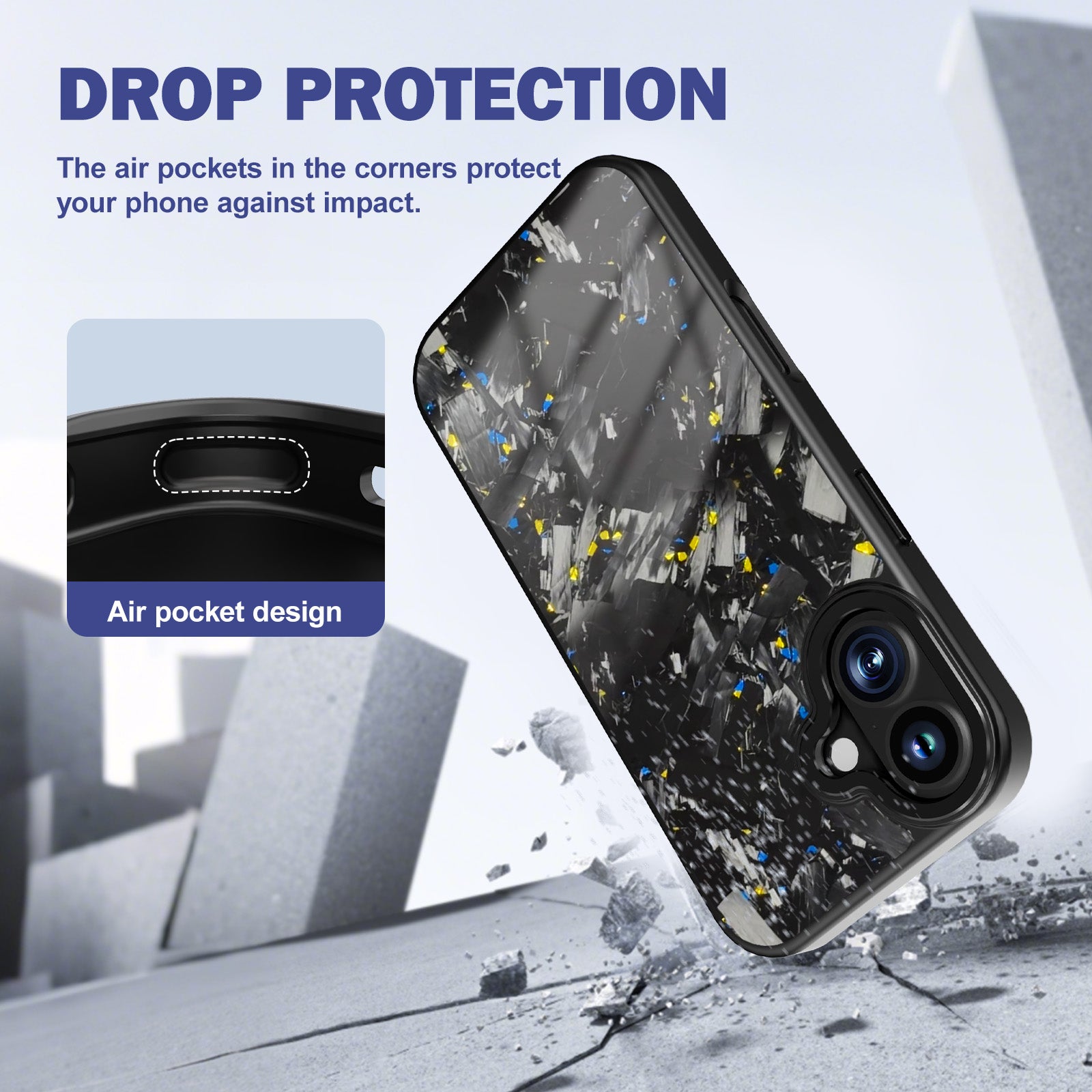 - Crafted from genuine chunk carbon fiber embedded with blue and gold tinfoil flakes